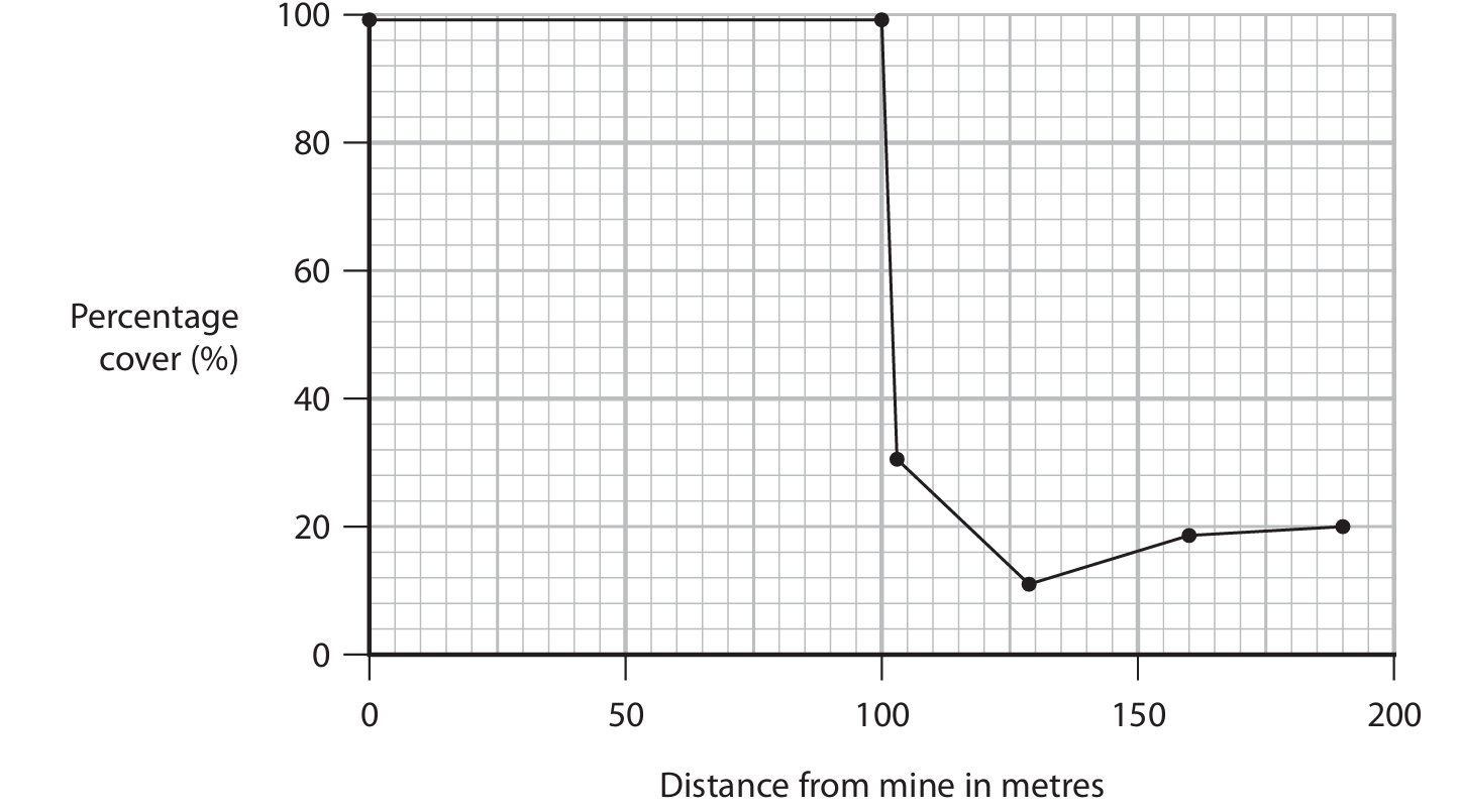 First, a measuring tape would be laid out running perpendicular from the mine edge, passing through both the 50m and 100m points. For a belt transect, quadrats (e.g., 1m x 1m squares) would be placed contiguously along the tape between, for example, 45m-55m and 95m-105m to cover each area. Alternatively, for random sampling, multiple random coordinates within a 10m band centered on 50m and another band centered on 100m could be generated, and a quadrat placed at each coordinate.