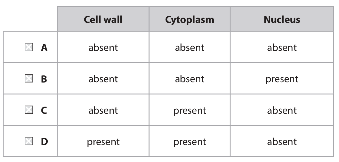(a) (i) Some structures in these onion cells are also found in human red blood cells. Which row in the table is correct for human red blood cells?