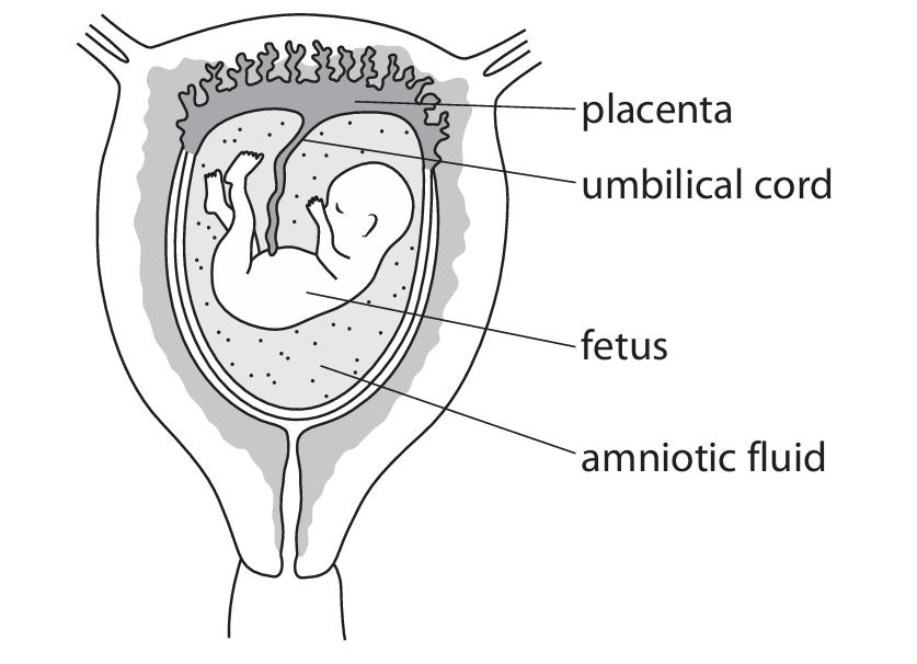 The diagram shows a fetus in the uterus of a woman.