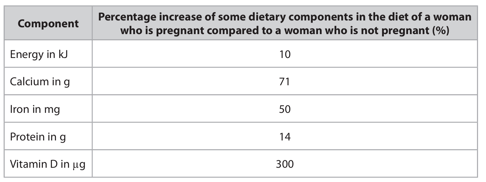 The table shows the recommended percentage increase of some dietary components in the diet of a woman who is pregnant compared to a woman who is not pregnant.