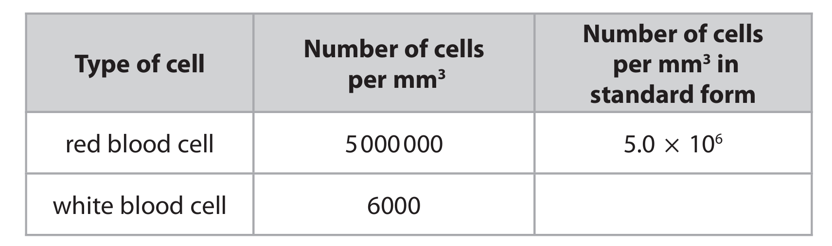 (i) Complete the table to give the number of white blood cells per mm3 in standard form.