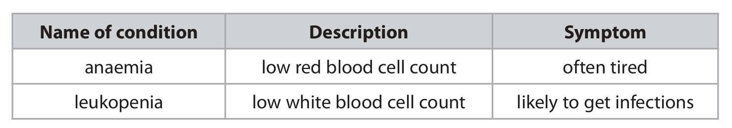 (b) The table gives names, descriptions and symptoms of two blood conditions.