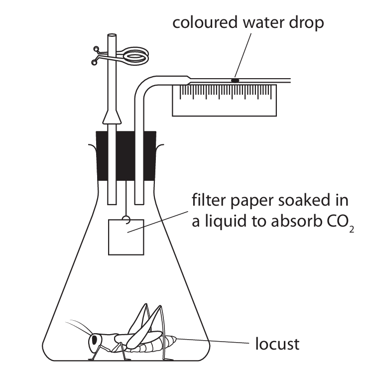(b)(i) The coloured water drop moves because the locust respires, using oxygen and producing carbon dioxide. The carbon dioxide is absorbed by the potassium hydroxide (KOH) on the filter paper. This consumption of oxygen and removal of carbon dioxide creates a decrease in gas pressure inside the tube, causing the coloured water drop to be drawn inward (towards the locust).
