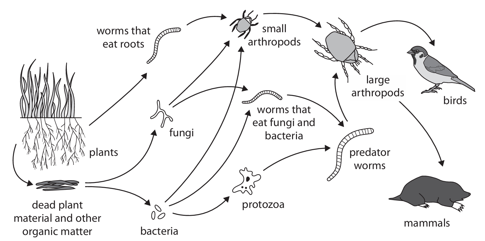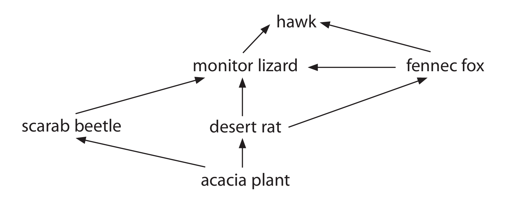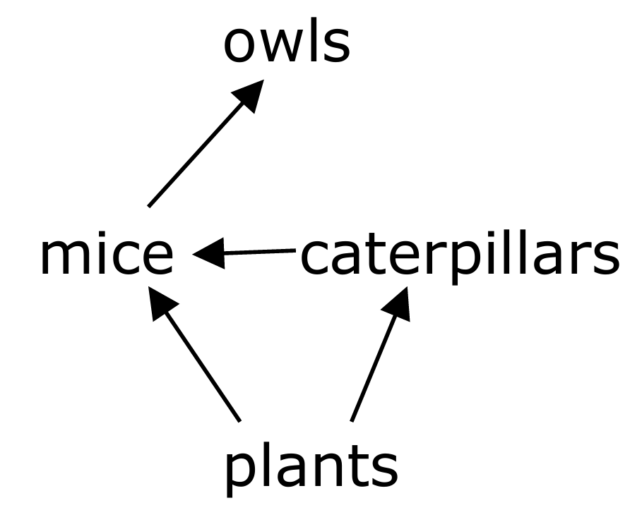 Example web: Plants have arrows to mice and caterpillars. Caterpillars have an arrow to mice. Mice have an arrow to owls.