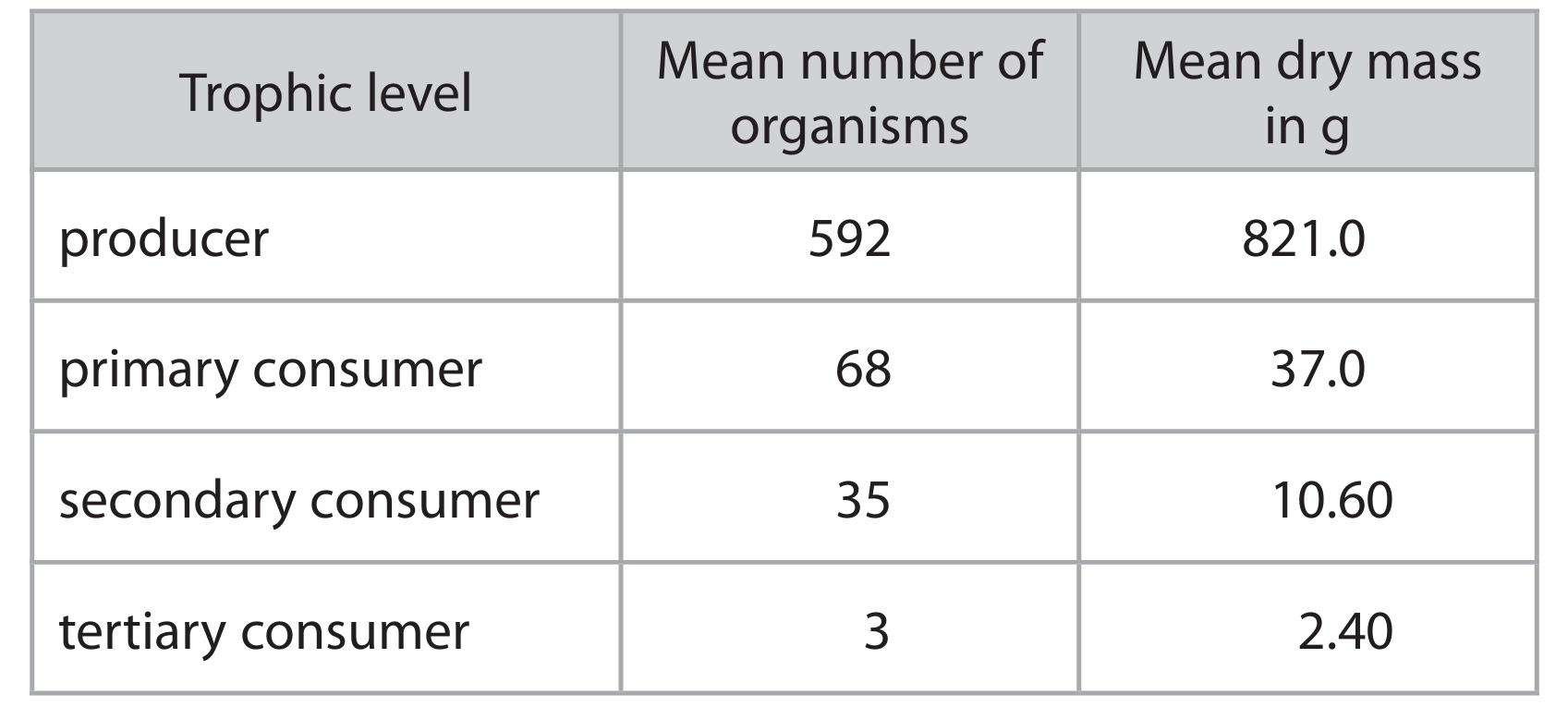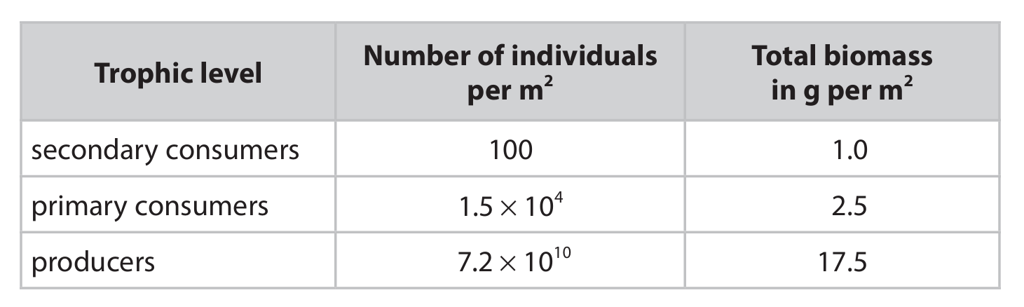 (b) The table shows the number of organisms per m² at different trophic levels in a pond community. It also shows the total biomass of these organisms per m².