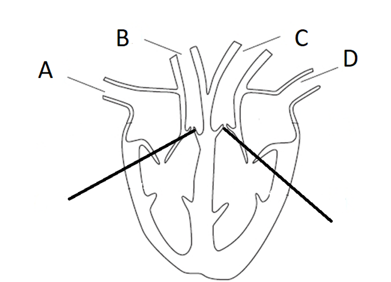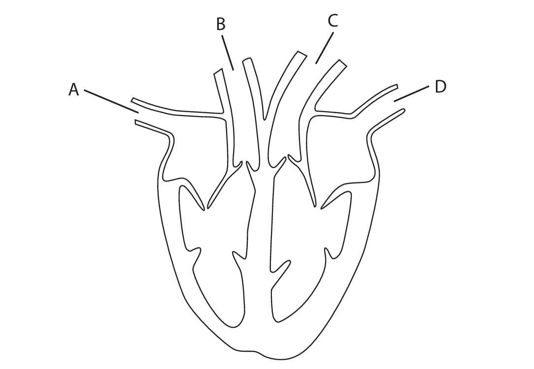 The diagram shows the human heart with four blood vessels labelled A, B, C and D.