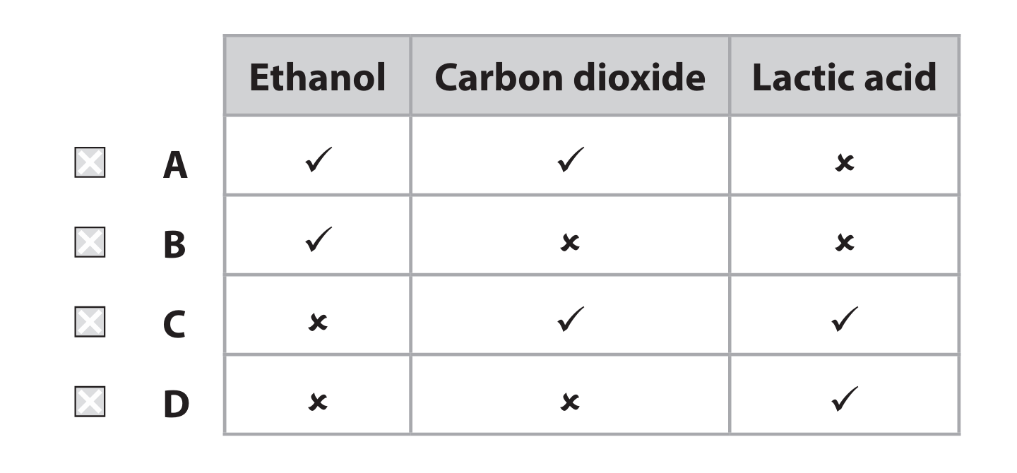 - D. glucose + oxygen → ethanol + carbon dioxide