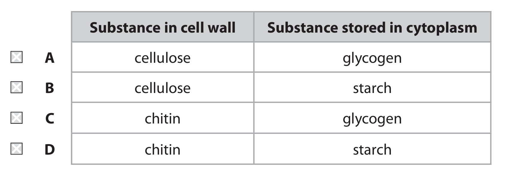(a)(i) C (chitin and glycogen)