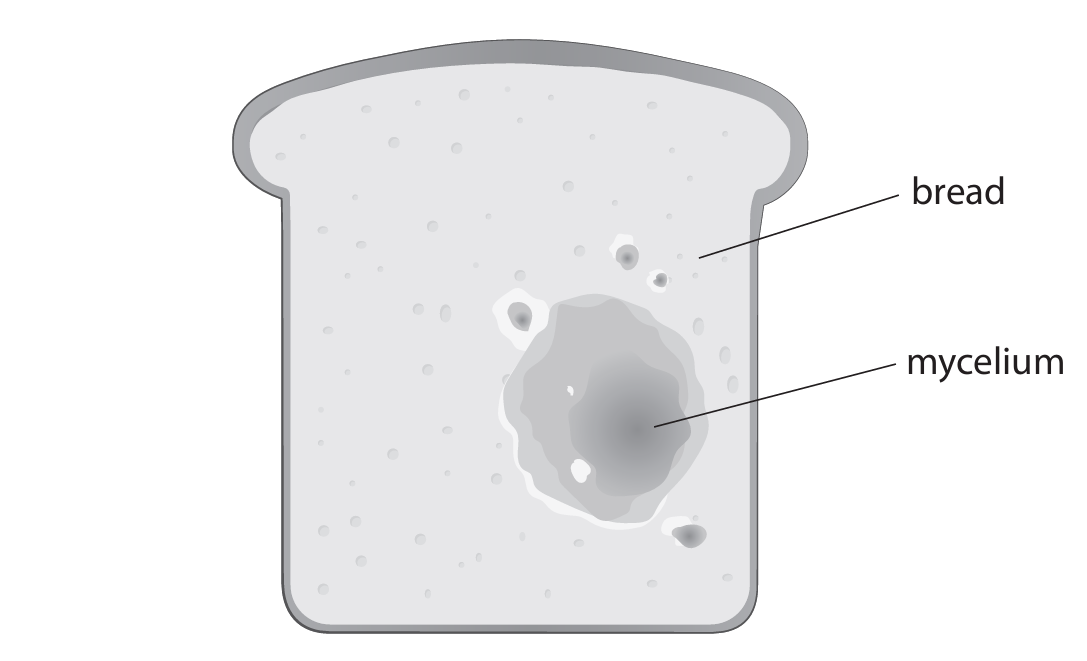 (b) The diagram shows the mycelium of an organism growing on a piece of bread.