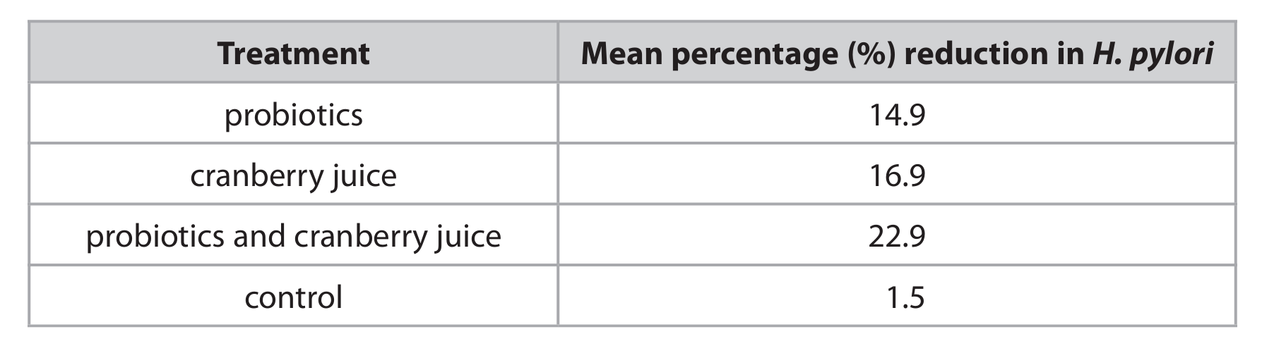 Explanation: By analyzing the data in the table, we can draw clear comparisons. The control group, which likely received a placebo or no treatment, showed only a 1.5% reduction, establishing a baseline. The probiotics alone led to a 14.9% reduction, and cranberry juice alone led to a 16.9% reduction. Both are substantially higher than the control, indicating they are effective treatments. However, when used together, the reduction jumps to 22.9%, which is higher than the sum of their individual effects if they were simply additive. This indicates that the two treatments may work well in combination, potentially enhancing each other’s effectiveness against H. pylori.