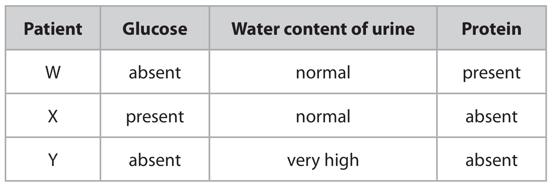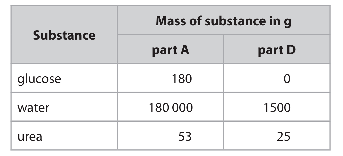(b) The table gives the mass of three substances transported in part A and in part D for all kidney nephrons during one day.