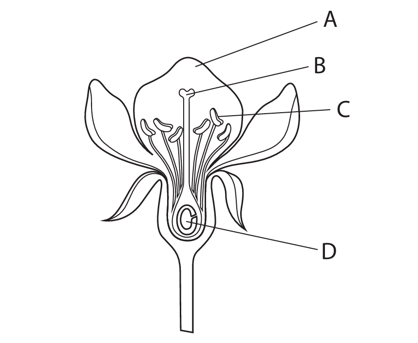 The diagram shows a section through a flower with parts labelled A, B, C and D.