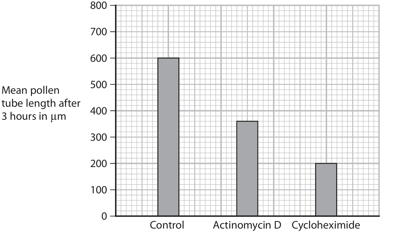 Explanation: Both chemicals inhibit pollen tube growth because they disrupt protein synthesis, which is essential for growth. Actinomycin D prevents transcription, the process where DNA is copied into mRNA. Without mRNA, the instructions for making proteins cannot reach the ribosomes. Cycloheximide prevents translation, where mRNA is read by ribosomes to assemble amino acids into proteins. Since both processes are blocked, protein synthesis decreases, slowing down pollen tube growth. The growth with actinomycin D is higher than with cycloheximide because some mRNA molecules might already be present in the pollen grain and can still be translated until they degrade, allowing limited protein production. With cycloheximide, translation is directly blocked, so even existing mRNA cannot be used, resulting in more severe growth inhibition.
