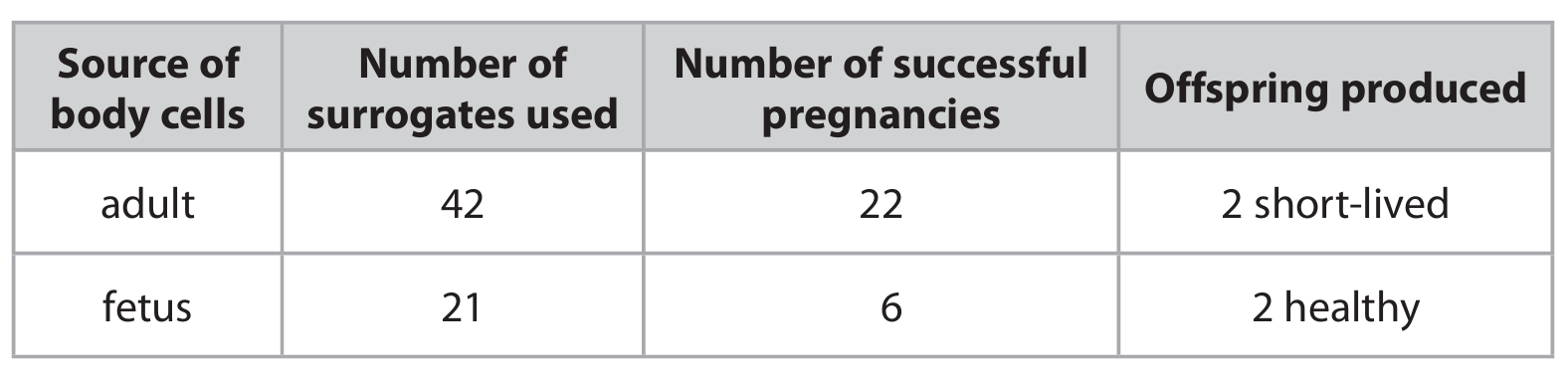 The table gives information about cloning using body cells from different sources.
