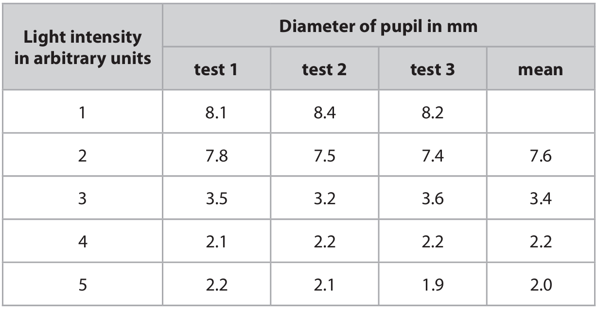 (ii) With reference to data in the table, describe the effect of increasing light intensity on the diameter of the pupil.