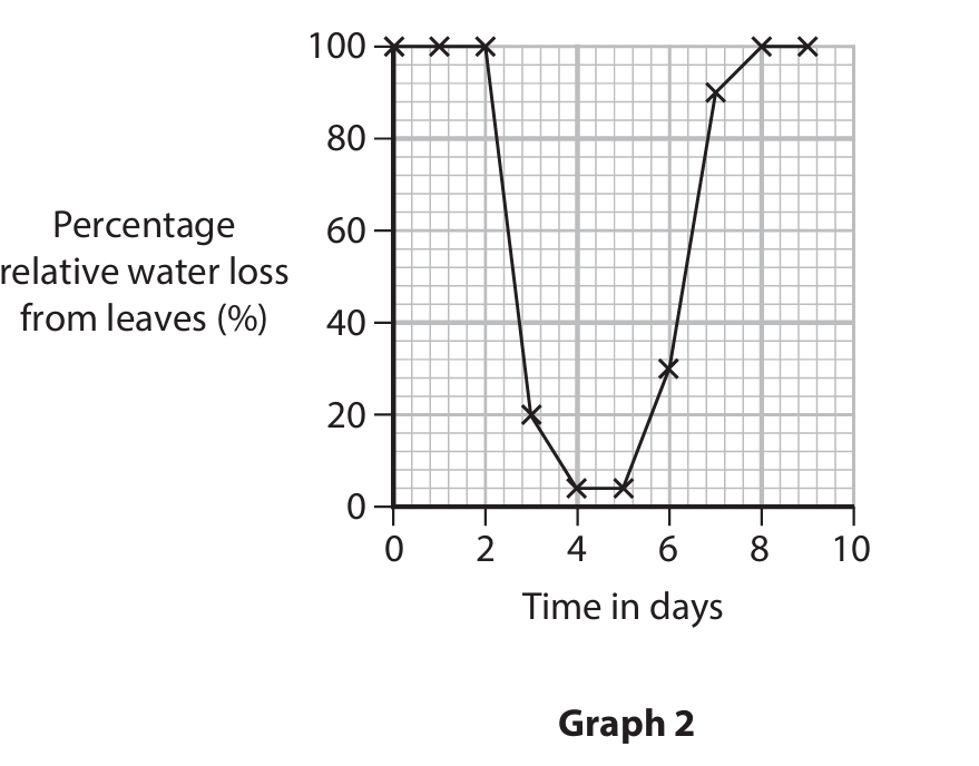 Graph 2 shows the changes in percentage relative water loss from the leaves of the plant.