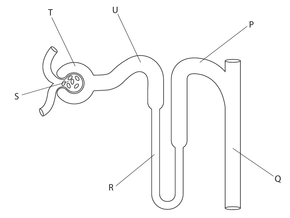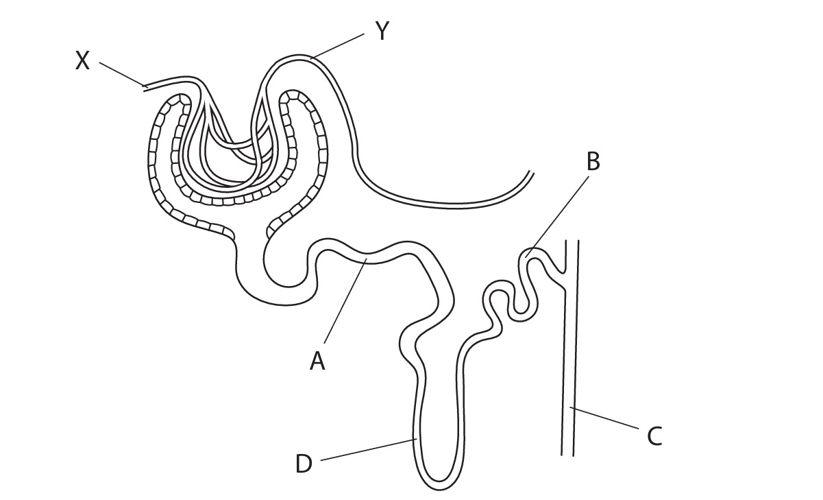 The diagram shows a nephron from a human kidney with some structures labelled.