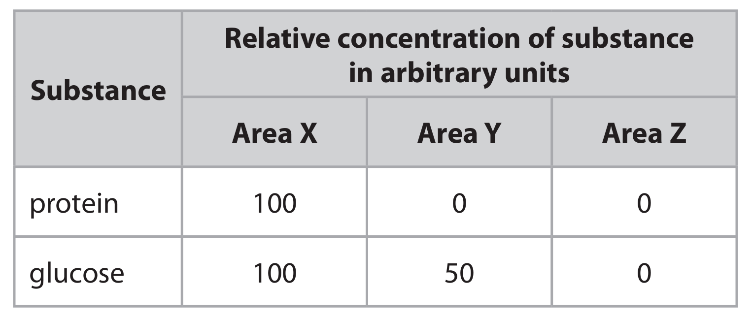 | Substance | Concentration in blood plasma (g/100 cm³) | Concentration in glomerular filtrate (g/100 cm³) | Concentration in urine (g/100 cm³) |