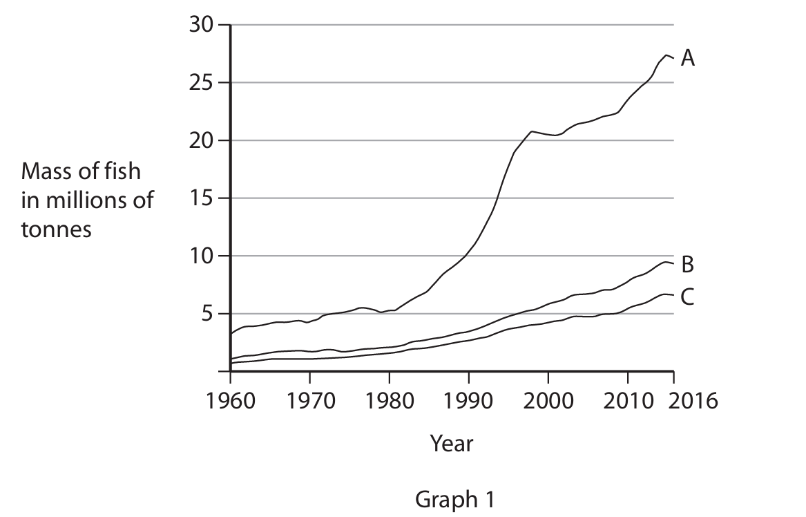 When analyzing the graphs, we can observe several key trends. Firstly, looking at Graph 1 (traditional fishing), all three lines for countries A, B, and C trend upwards from 1960 to 2016. This indicates a general increase in the mass of fish caught using traditional methods over this 56-year period. The lines for the three countries appear to rise at a similar rate, suggesting the increases were by almost the same proportion in each country.