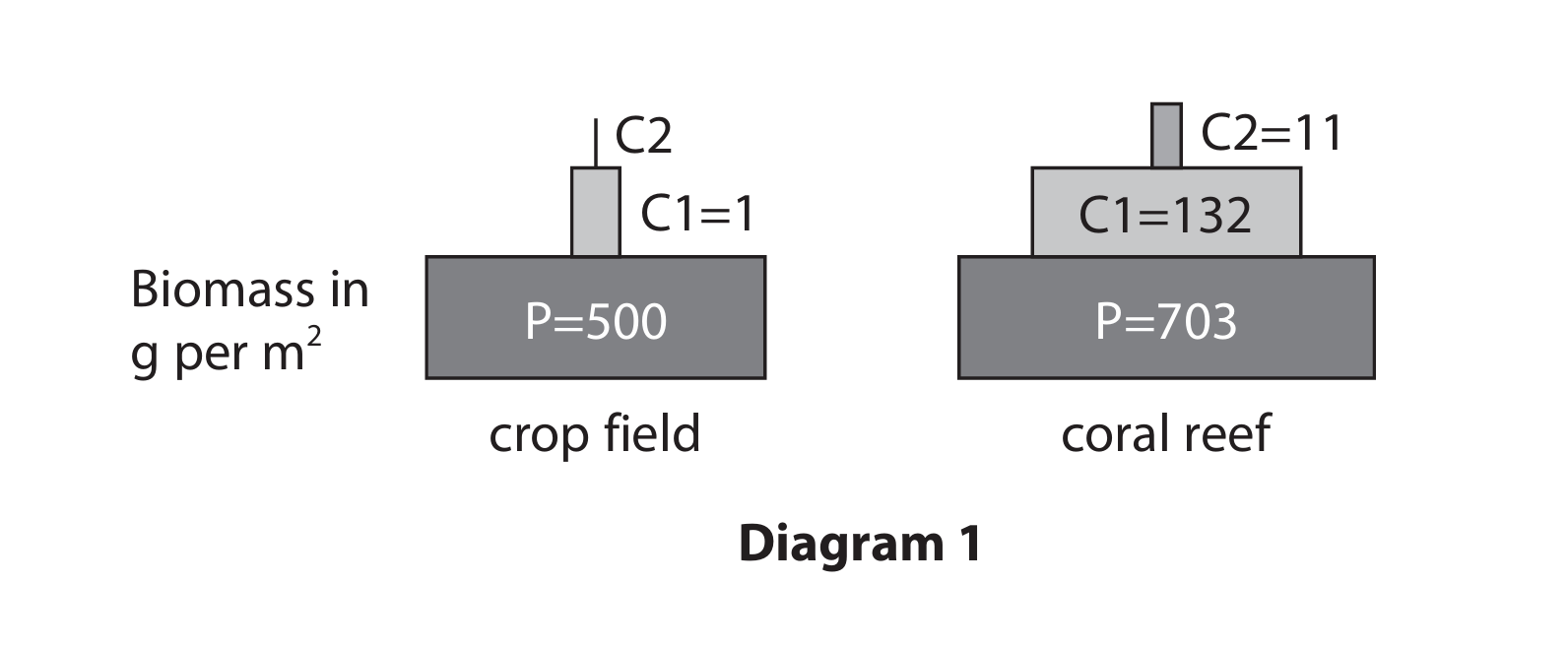 (a) Diagram 1 shows pyramids of biomass for a crop field ecosystem and for a coral reef ecosystem.