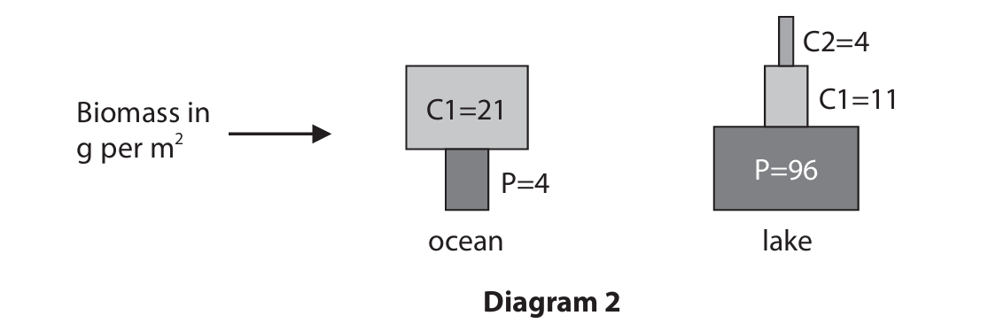 (b) Diagram 2 shows pyramids of biomass for an ocean and a lake.