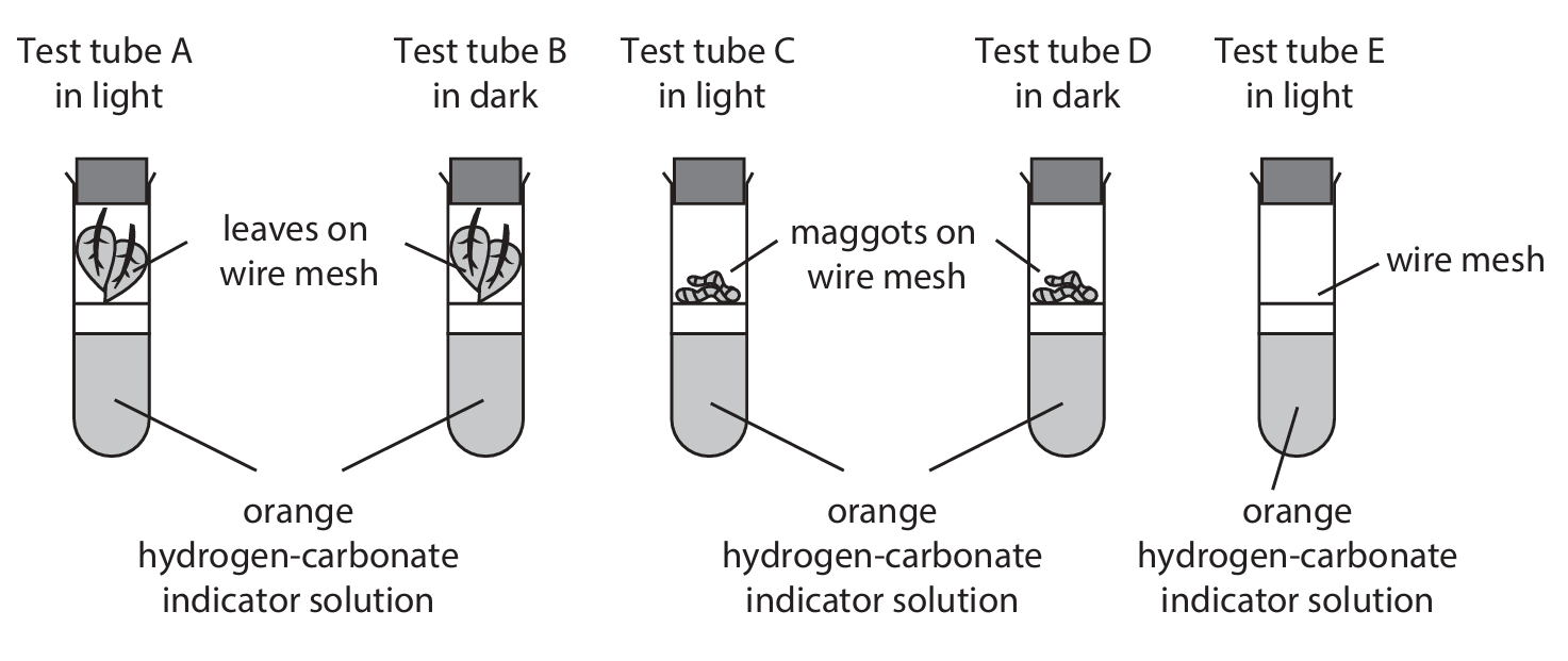 1. tube C / tube D / maggots produce \(CO_{2}\) / \(CO_{2}\) increases (light and dark) / eq (1)