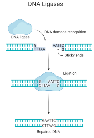- DNA ligase seals the sugar-phosphate backbone between adjacent nucleotides.