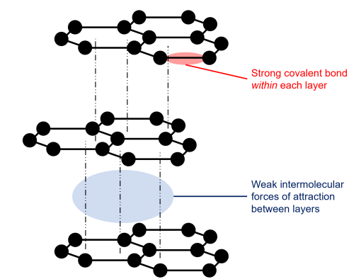 - High melting point → Strong covalent bonds within layers.