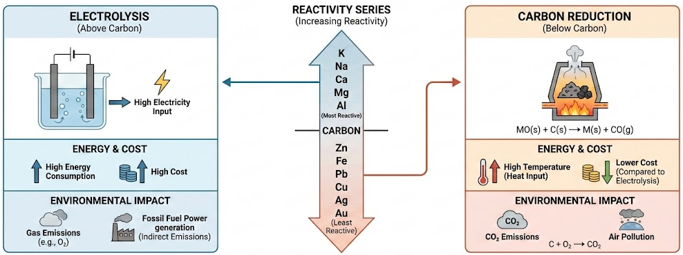 - If the metal is above carbon → electrolysis is required.