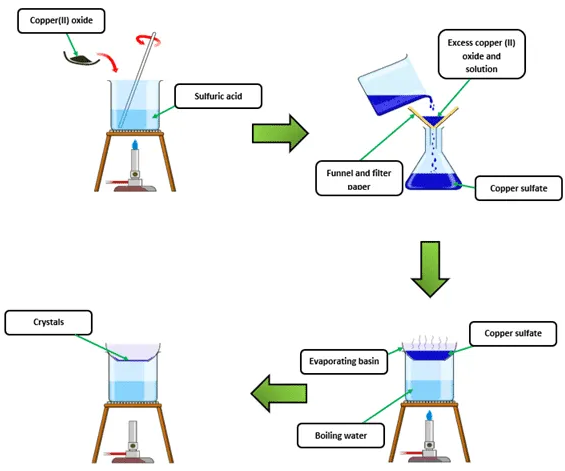 Preparing copper(II) sulfate from copper(II) oxide and sulfuric acid: