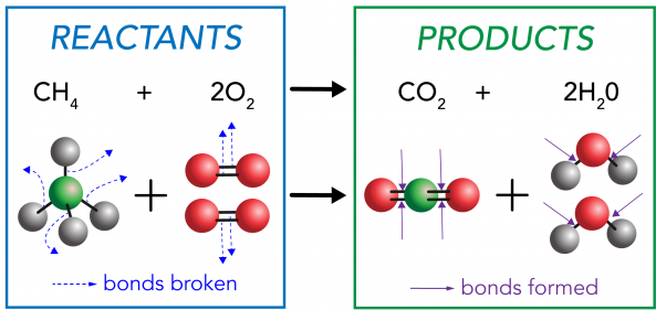 - Bonds in \( \mathrm{CH_4} \) and \( \mathrm{O_2} \) are broken (endothermic).