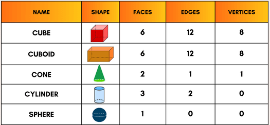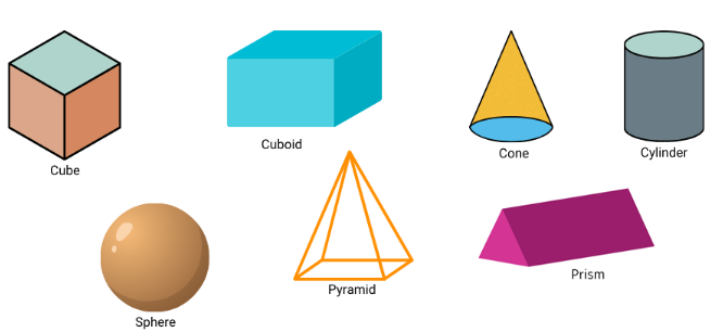 Notes: cube, cuboid, prism, pyramid, cylinder, sphere and cone