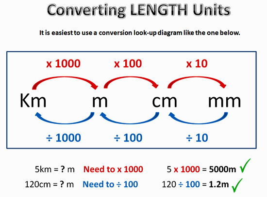 When converting length, multiply or divide by 10, 100 or 1000.