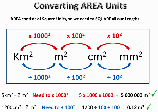 A convert measurements within the metric system to include linear and area units (e.g. cm² to m² and vice versa)