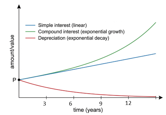 Instead of adding or subtracting the same amount each year, we multiply by a multiplier every year.