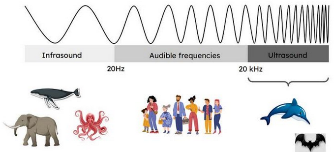 - Ultrasound (> 20 000 Hz): bats, dolphins, medical imaging.
