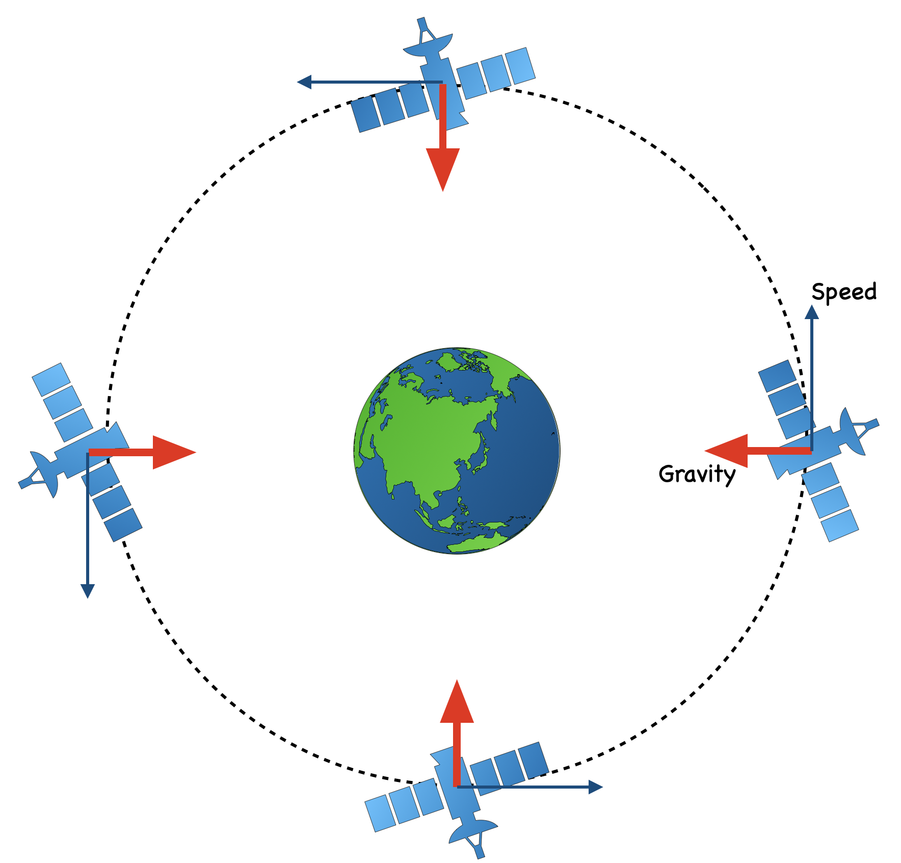 - Earth’s gravity pulls the satellite toward the Earth.