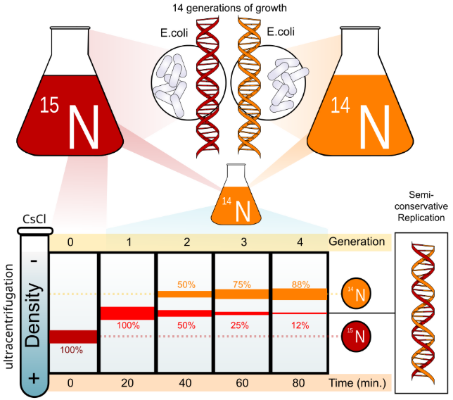 - DNA extracted after each generation → spun in centrifuge to separate by density.