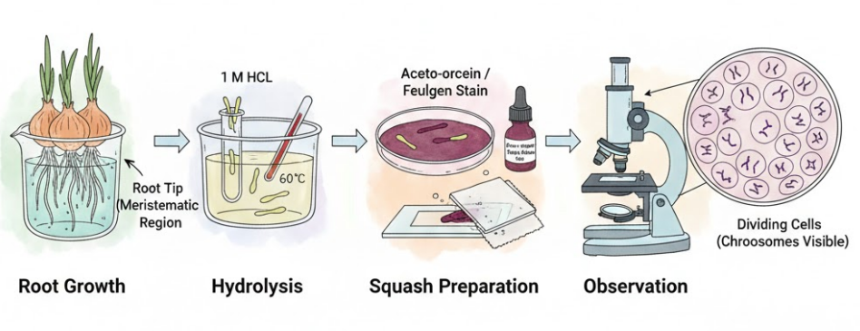 - Observation: Low power (×10) → locate meristematic cells. High power (×40/×100) → identify mitotic stages.