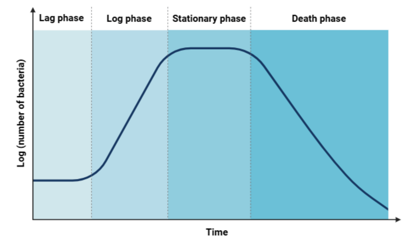 - Log (exponential) phase: Rapid cell division; maximum growth rate.
