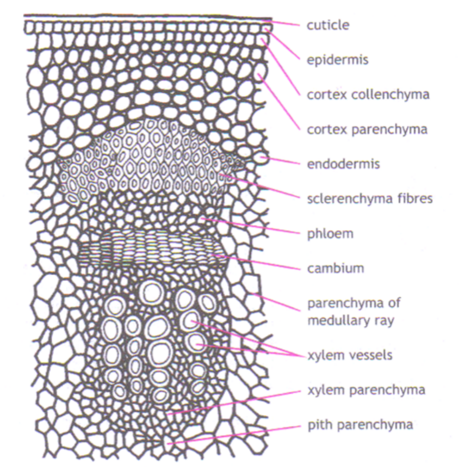 (iii) identify sclerenchyma fibres, phloem, sieve tubes and xylem vessels and their location.