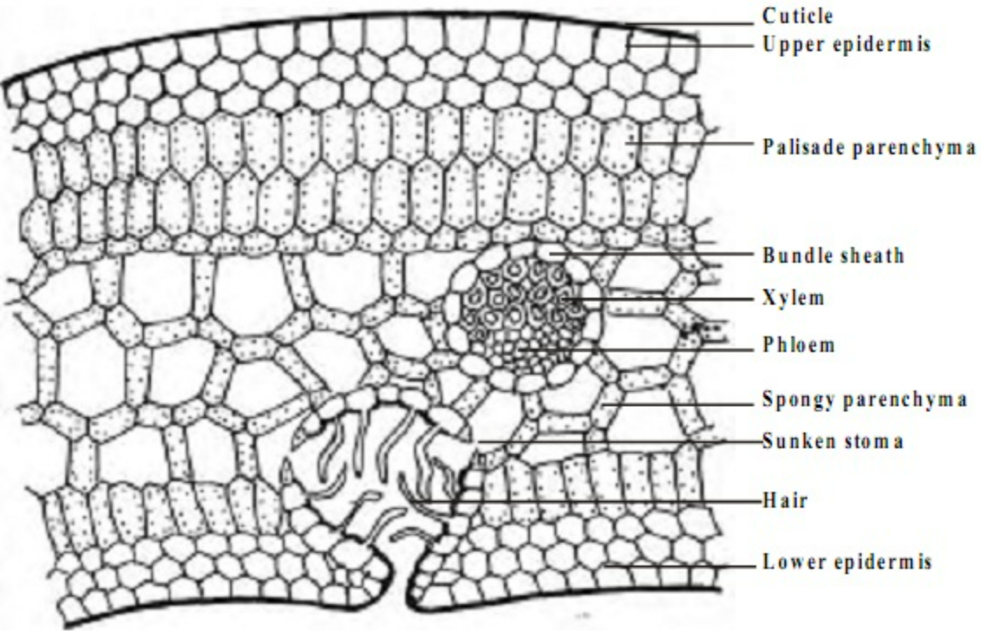 - Vascular bundle (vein): Xylem on top, Phloem below.