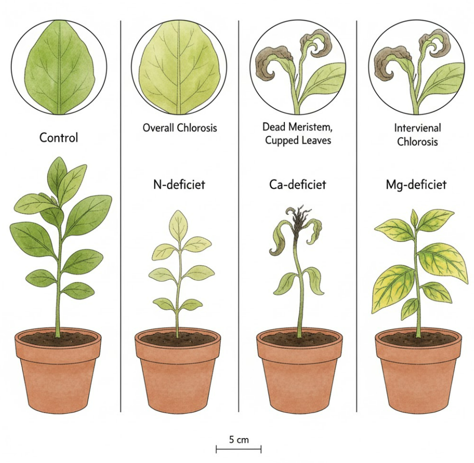 | Nitrate (NO₃⁻) | Stunted growth, older leaves pale/yellow (chlorosis), reduced mass |