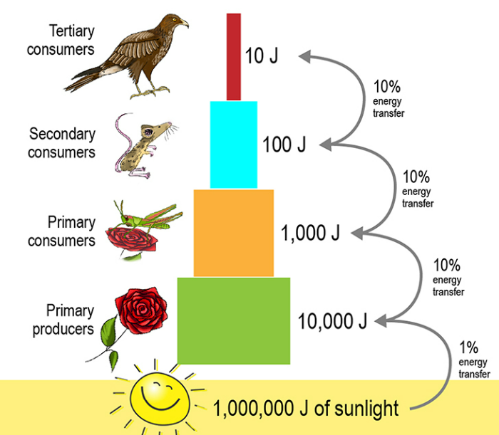 | Energy/Biomass decreases | Because of heat loss, excretion, respiration |