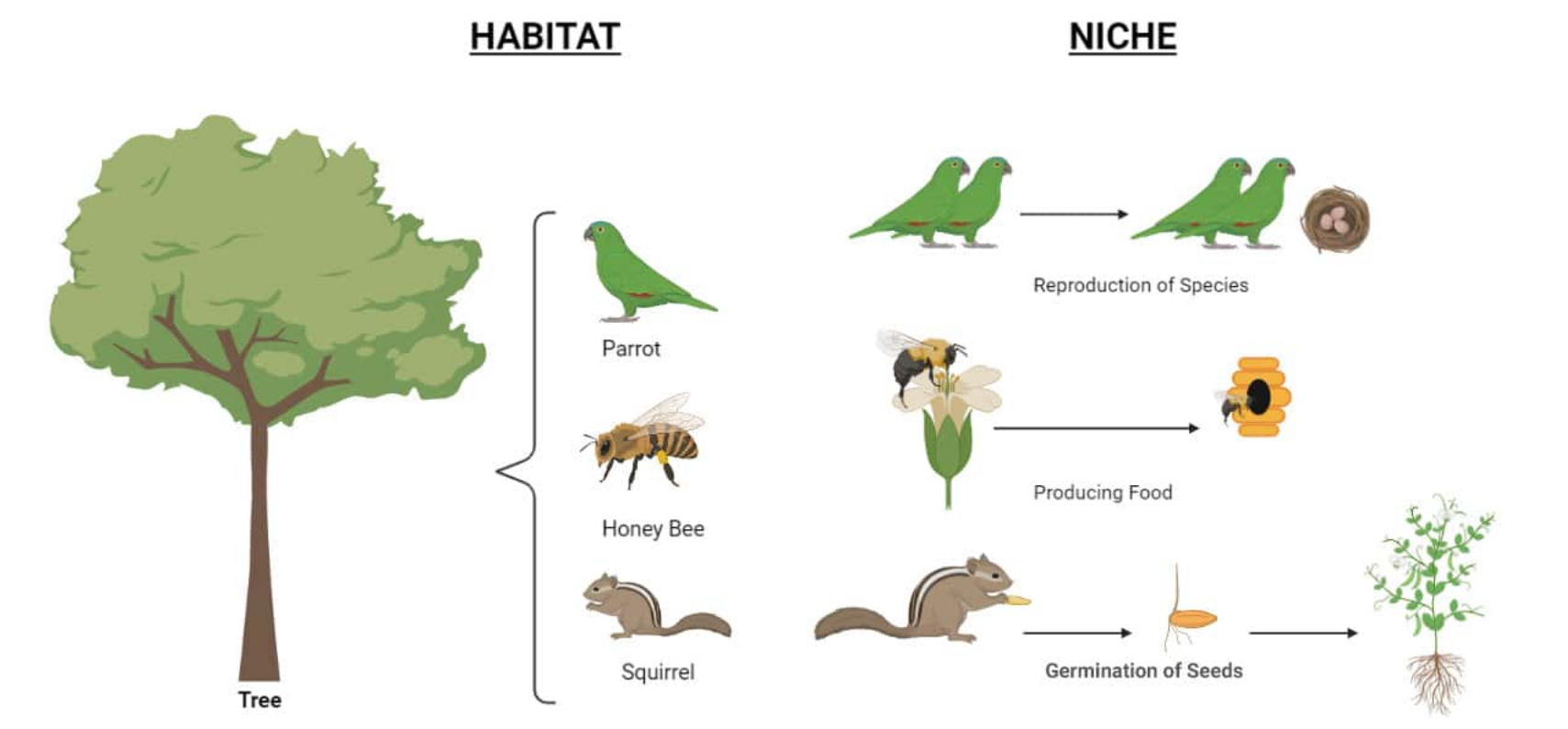 Two birds living on the same tree may feed at different heights. Different feeding spots = different niches.