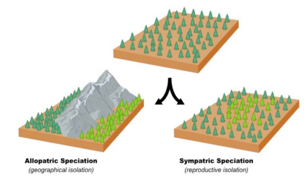 | Sympatric | Same geographical area | Behavioural, temporal, reproductive isolation | Populations stop interbreeding despite living together |