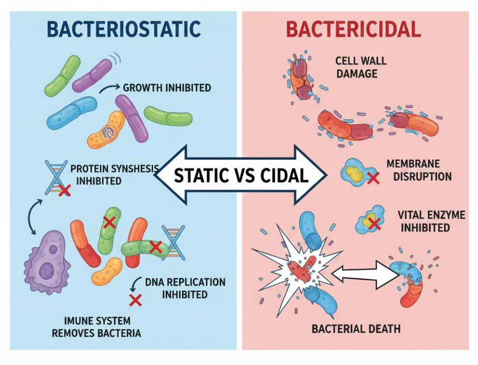 | Effect on bacteria | Bacteria remain alive but cannot divide | Bacteria are destroyed |