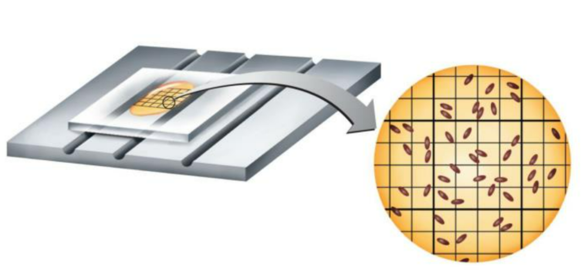 - A sample is placed on a haemocytometer, a special slide with a ruled grid.