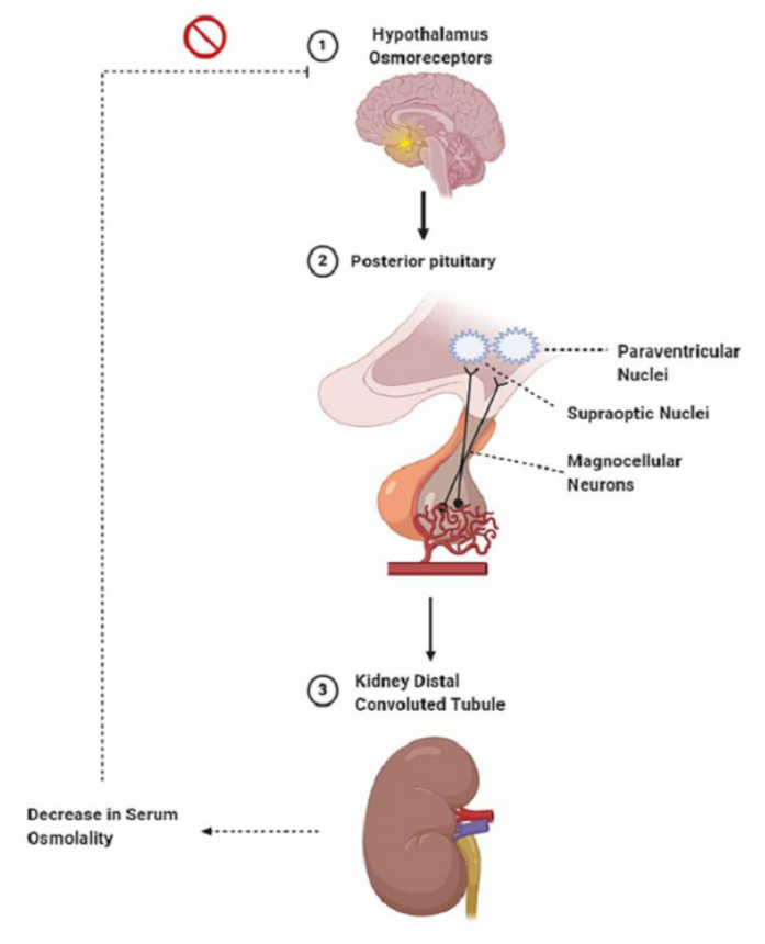 - 7.21 understand how the pituitary gland and osmoreceptors in the hypothalamus, combined with the action of antidiuretic hormone (ADH), bring about negative feedback control of mammalian plasma concentration and blood volume