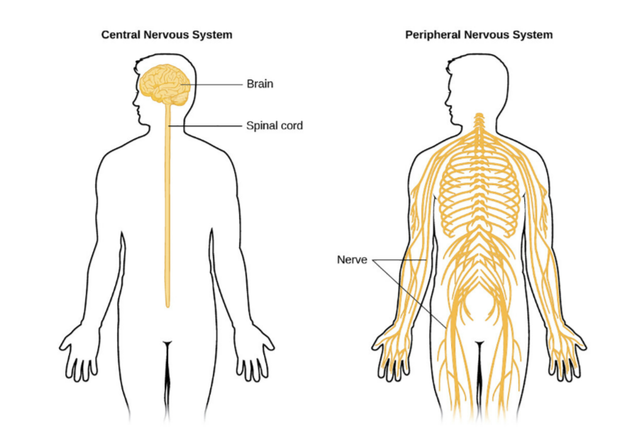CNS: Brain + spinal cord → integrates info, controls responses.